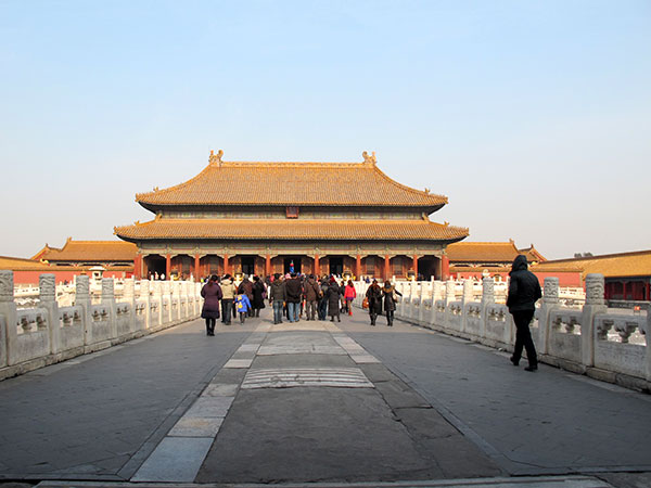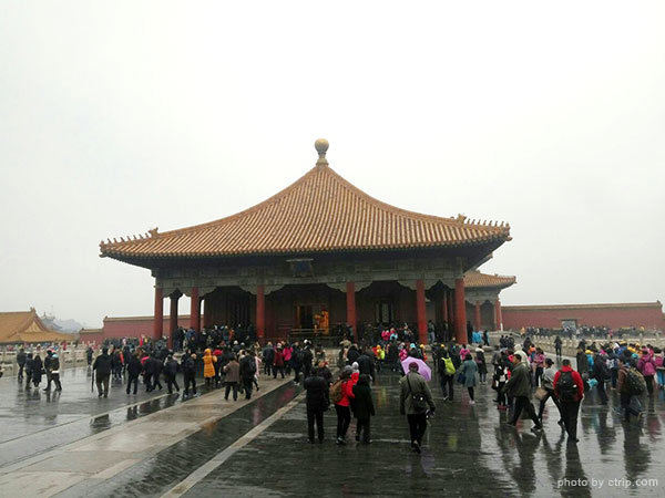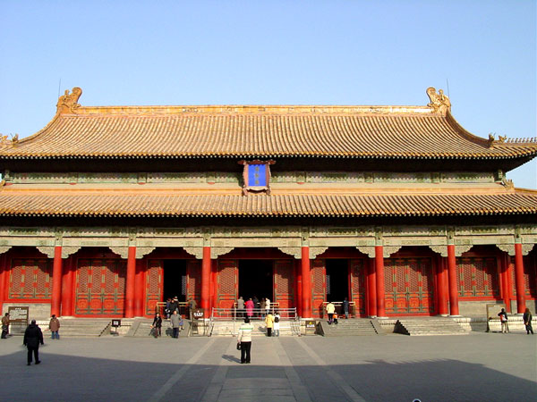 The Hall of Central Harmony (Zhonghe Hall) is one of 'the three main palaces' in Beijing Forbidden City. It is located between the Hall of Supreme Harmony and the Hall of Preserving Harmony. The hall was the place for the emperor to take a rest before holding grand ceremony and accepting officials' worship in the Hall of Supreme Harmony. While holding a memorial ceremony for the heaven and earth, the emperor would review the congratulatory message the day before; also would check the seed and farm implements before the altar of the god of agriculture. Central Harmony means 'everything should be finished in a perfect way so that the harmony comes into being'.